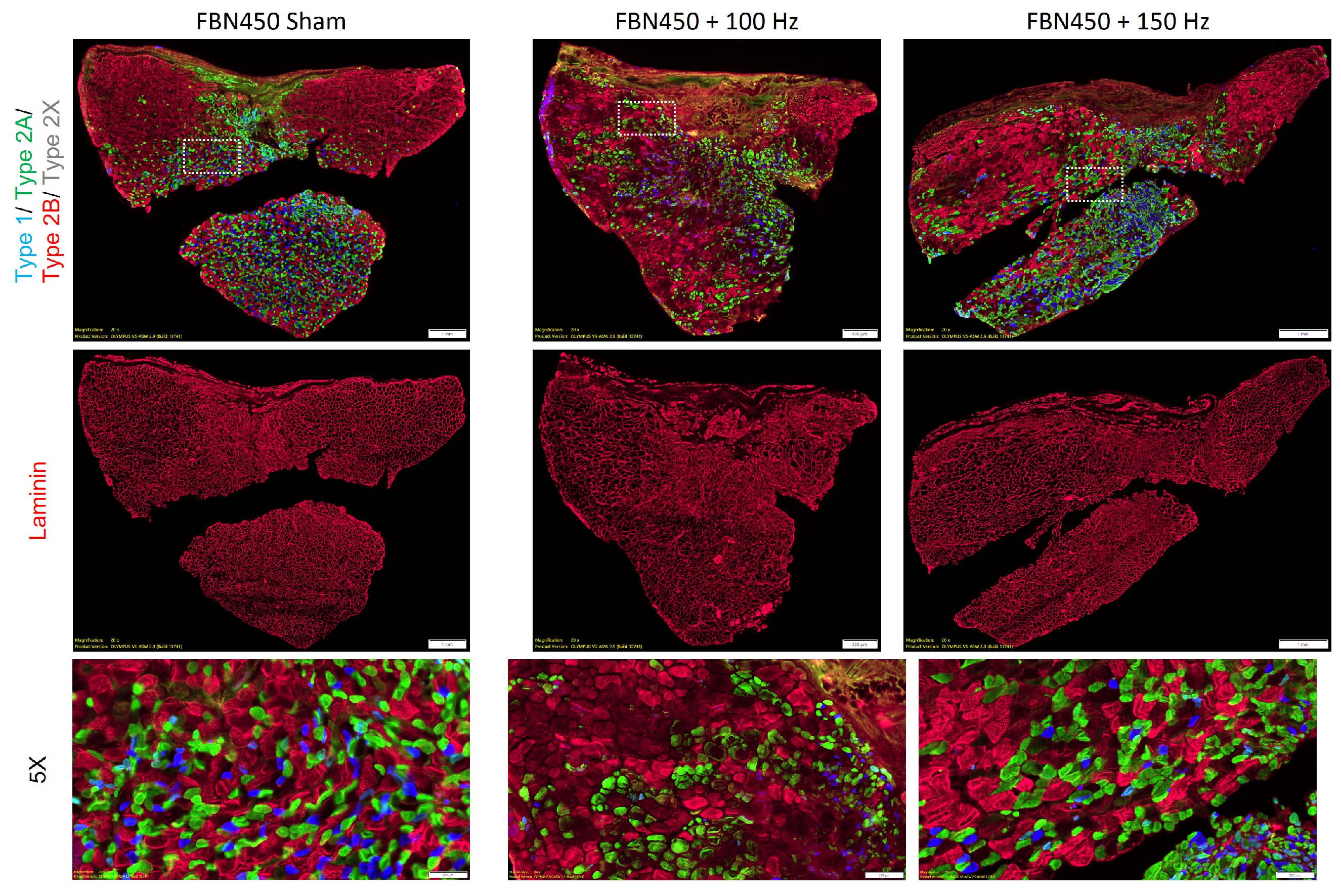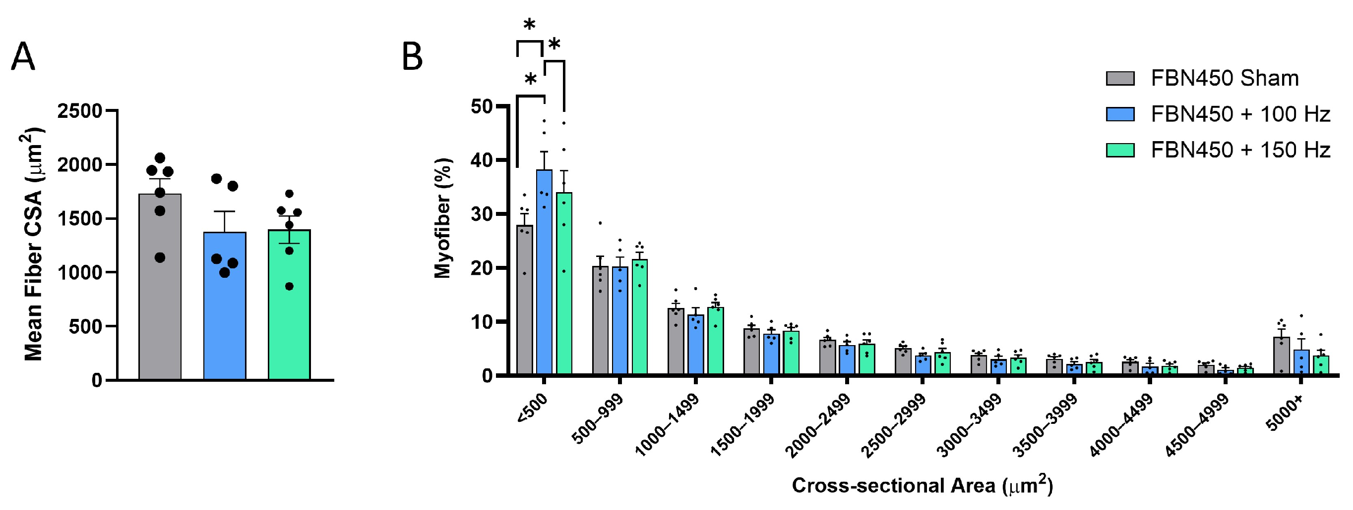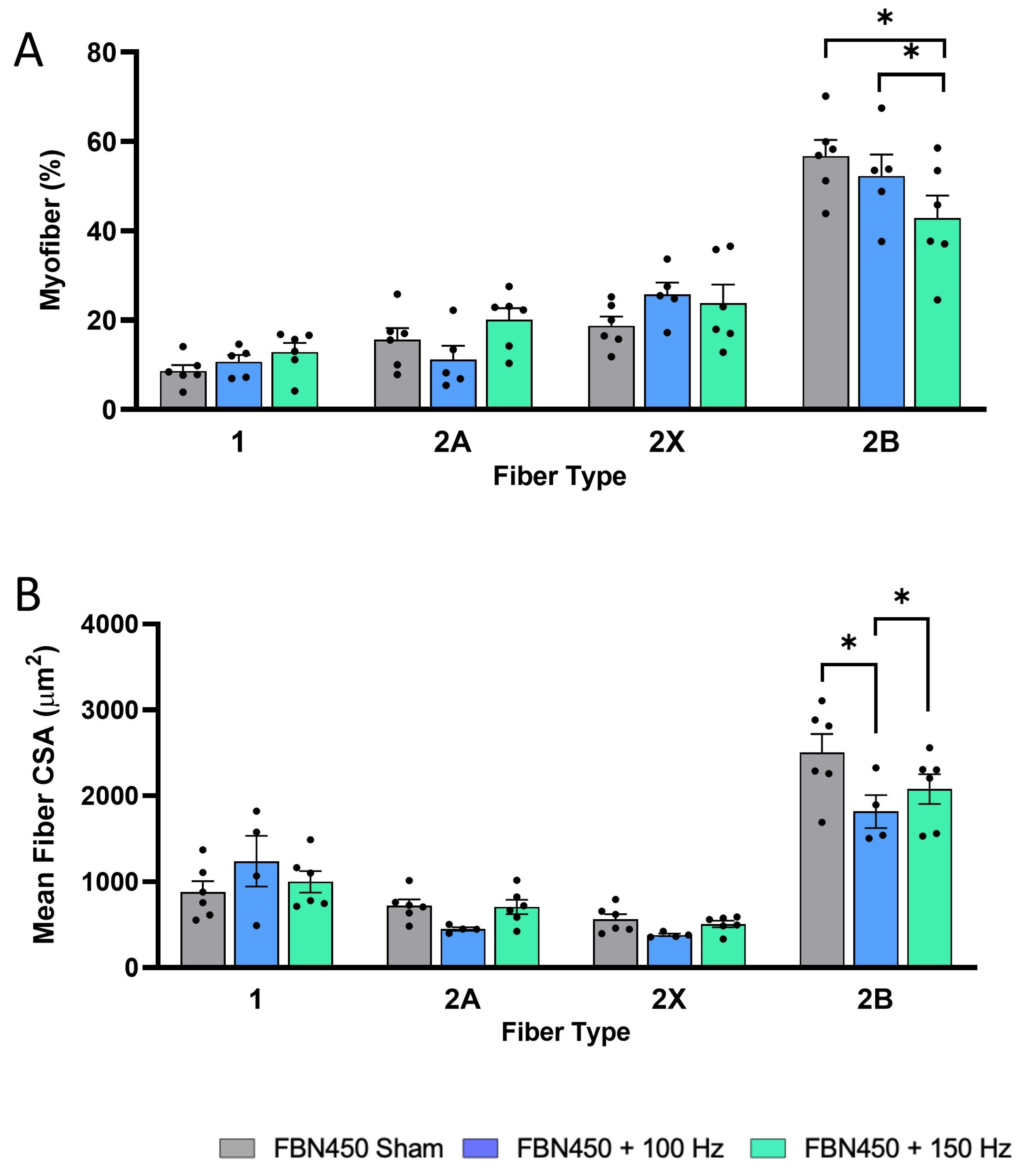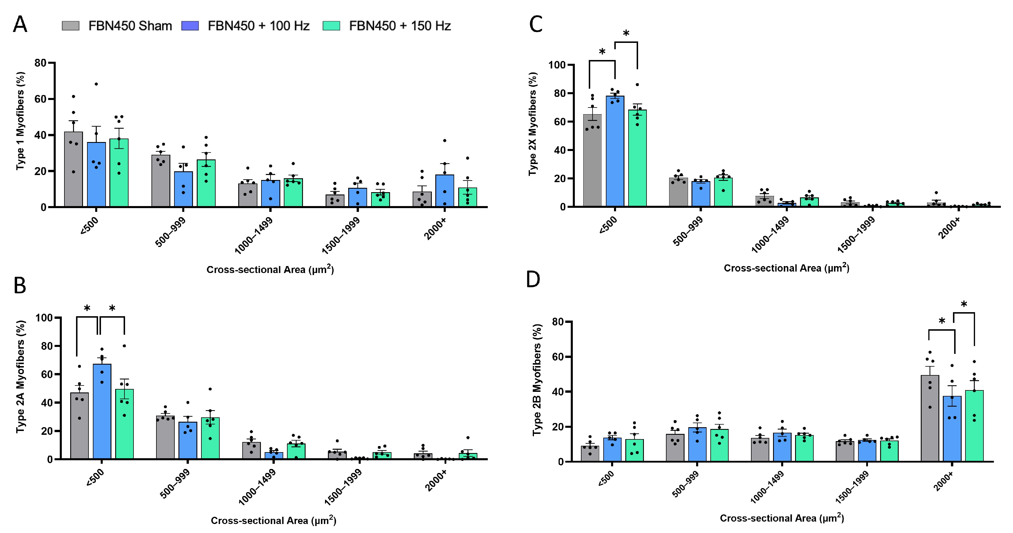 18] for image analysis was used to quantify the myofiber cross-sectional area (CSA) and fiber-type distribution (n = 5–6 muscles/group). In the FBN450 sham group, 5623 ± 435.3 (mean ± standard error of mean) fibers were detected and analyzed in the MyoQuant MATLAB program (R2024b). In the FBN450 + 100 Hz and FBN450 + 150 Hz groups, 3628 ± 327.2 fibers and 5713 ± 804.5 fibers were detected and analyzed, respectively.