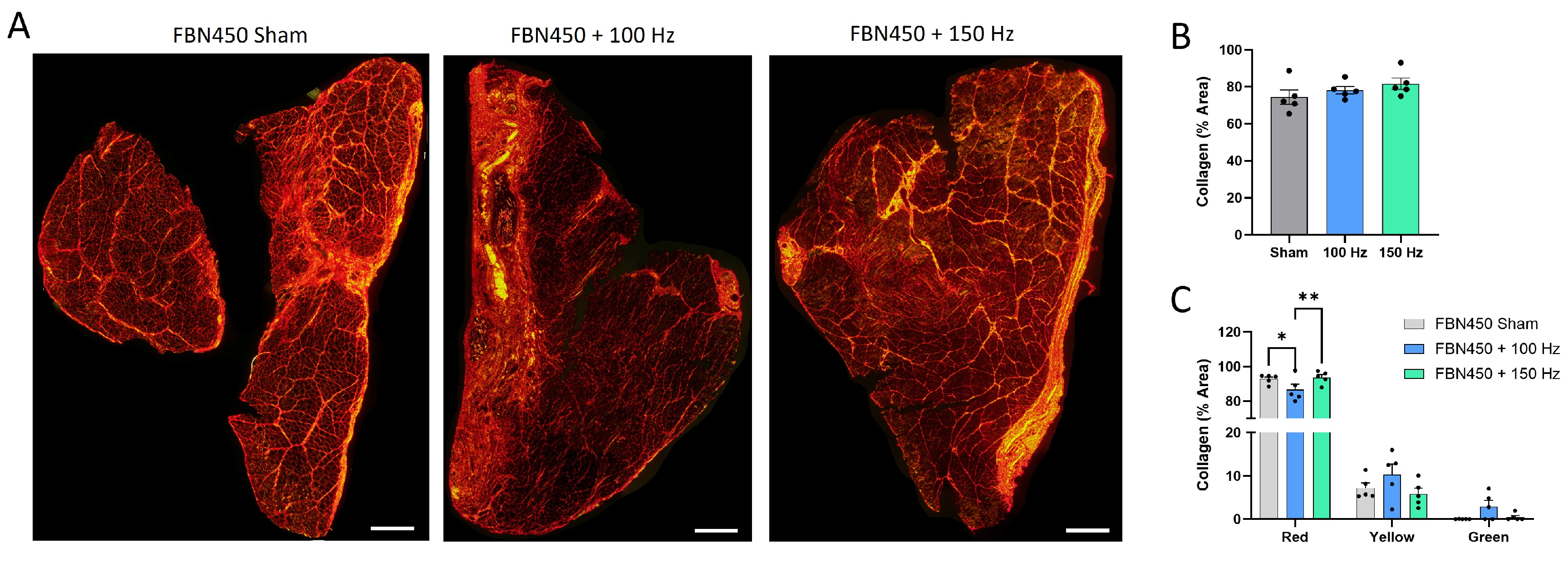 TA muscles (n = 5/group) from each animal were cryosectioned and stained with the Picrosirius Red (PSR) Stain kit (Polysciences, Catalog no. 24901). The muscle samples were fixed in 10% formalin, rinsed with DI water, and stained with PSR for 60 min. Then, the samples were rinsed in HCl solution, rinsed again with DI water, and dehydrated in 70% ethanol for 30 s. A glass cover slip was secured over the samples with Cryoseal™. The samples were then imaged using polarized light microscopy with TerziCam Pro software (Terzic Instruments LLC; Ballwin, MO, USA), and the area fraction of total collagen, as well as collagen fractions stained red, yellow, and green, were determined using a custom MATLAB code (R2024b).