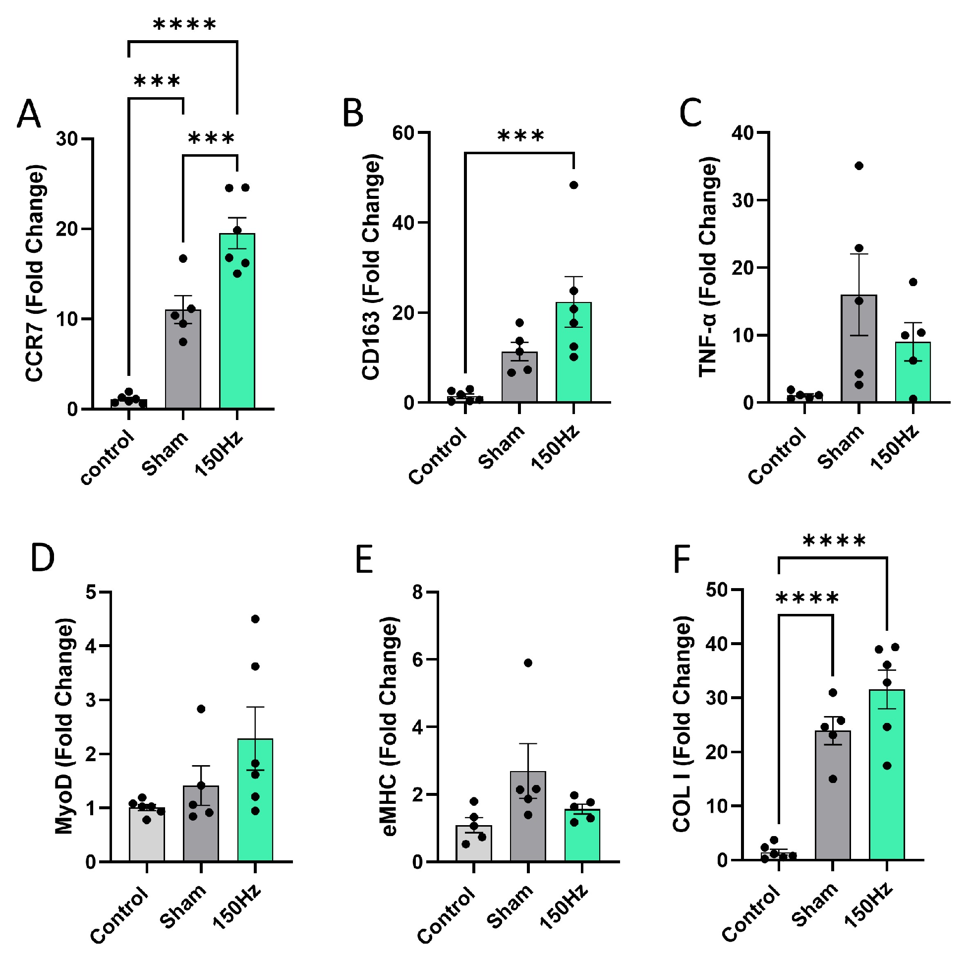 TA muscle (n = 5–6/group) segments of approximately 50 mg containing the defect area and surrounding musculature were homogenized in Trizol LS reagent, followed by RNA isolation and purification using the RNAeasy mini kit (Qiagen, Hilden, Germany). The RNA yield was quantified using the NanoDrop 2000c Spectrophotometer (Thermo Scientific, Waltham, MA, USA), and the 260/280 and 230/260 ratios were used to verify purity. RNA was reverse-transcribed using iScript Reverse Transcriptase Supermix (Bio-Rad, Hercules, CA, USA). Primer sets were synthesized by the Millipore Sigma oligos design tool (