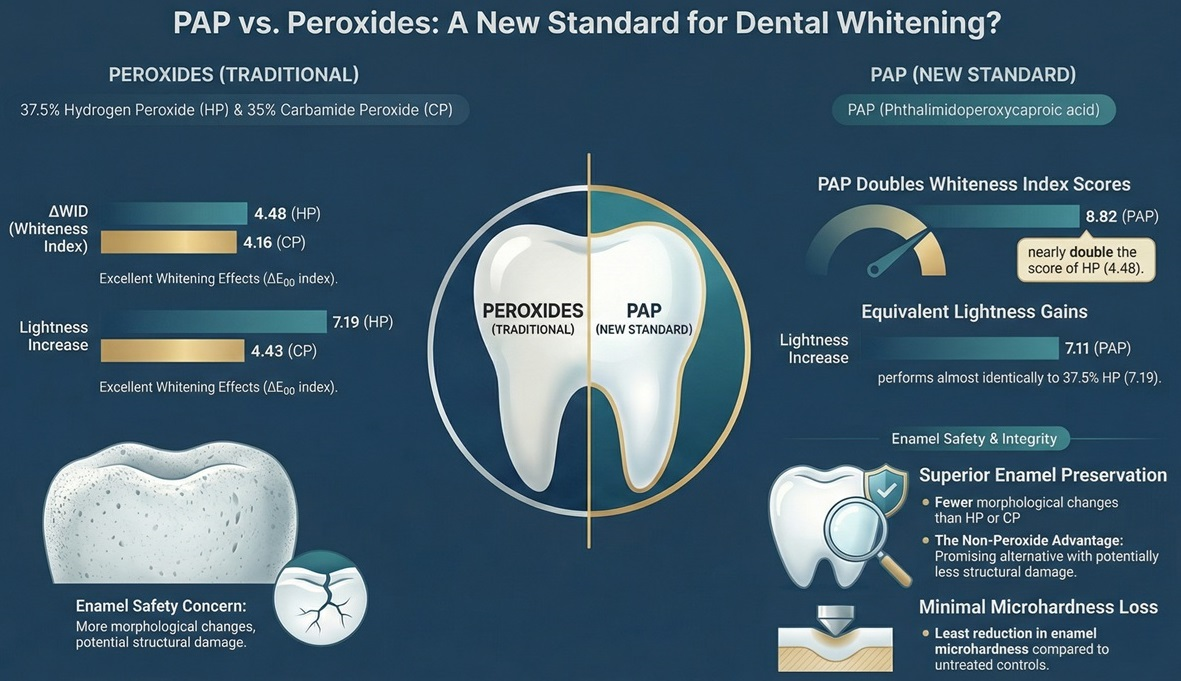 11]. This study addresses a gap in the dental literature by providing comparative evidence on PAP, an agent whose mechanism of action and efficacy have been less studied than those of peroxides.