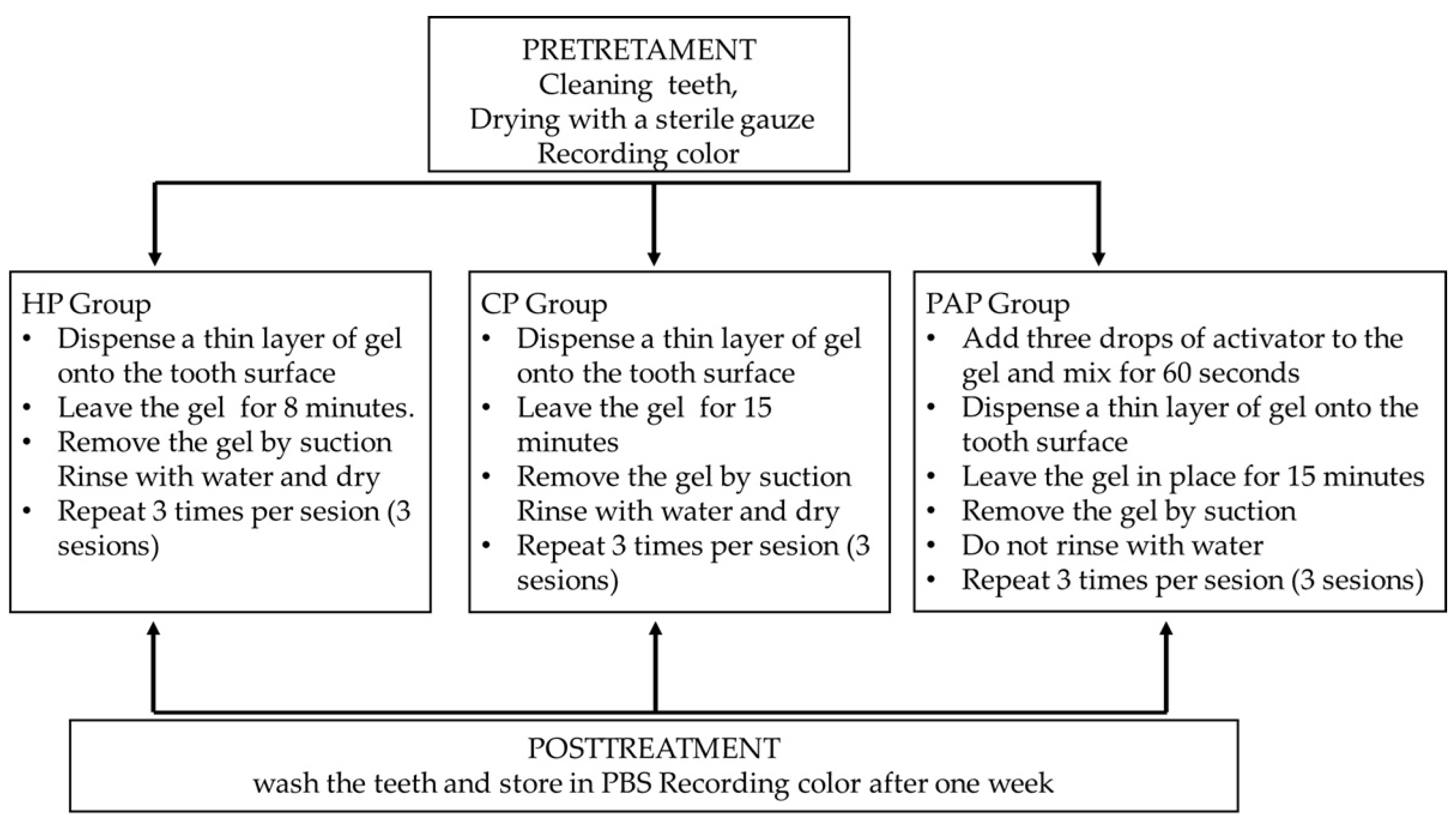 ®, Septodont, Lliçà de Vall, Barcelona, Spain). Between the different stages of the study, samples were stored in PBS. Each group underwent three whitening sessions, with three applications of the bleaching agent per session, following the manufacturers’ recommended protocols as outlined in