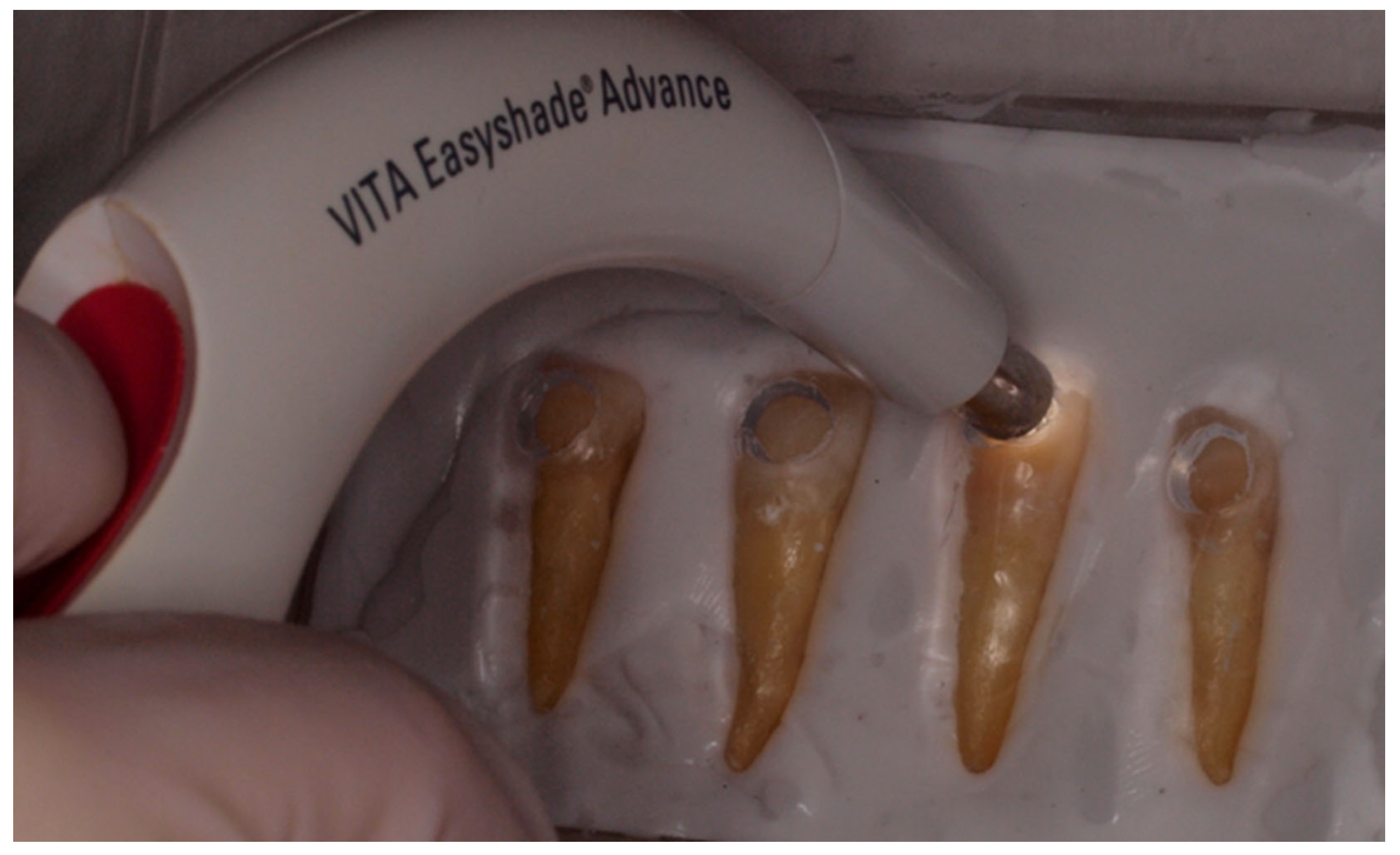 Color measurements were performed using a spectrophotometer (Vita Easyshade, VITA Zahnfabrik, Bad Säckingen, Germany) under standardized ambient lighting. An individualized positioning splint was used for the tip of the spectrophotometer to ensure the repeatability of the measurements.
