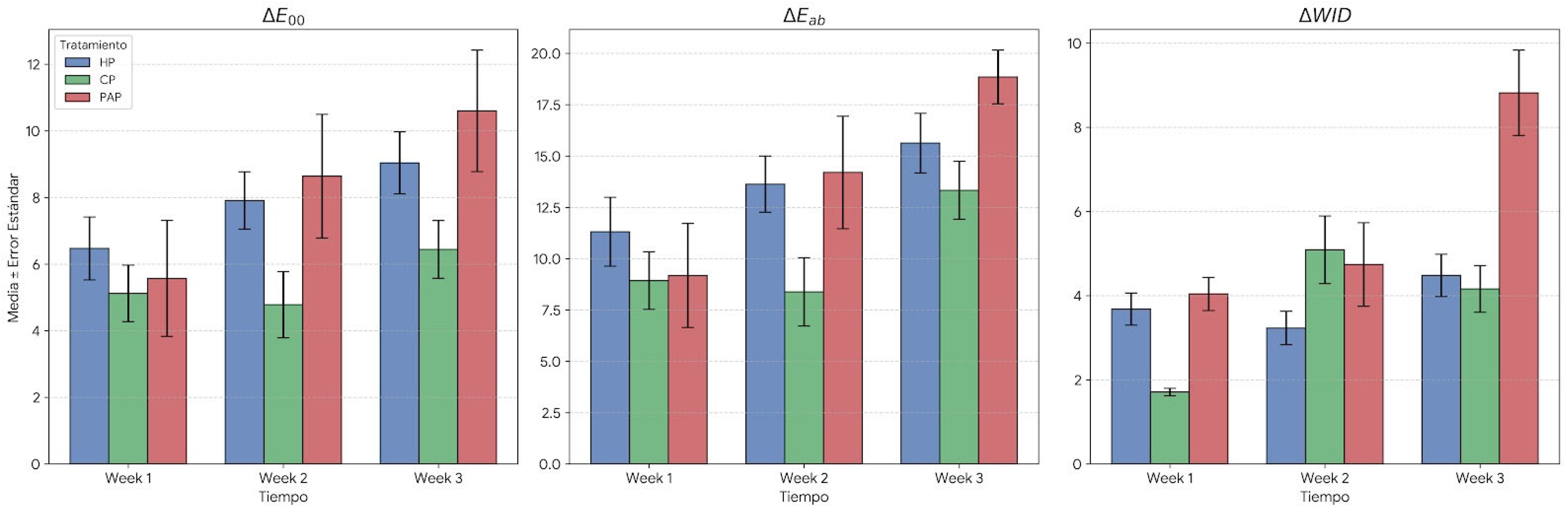 Color changes were evaluated using a spectrophotometer, employing the CIELab chromatic coordinates. Lightness was the parameter that showed the most changes in all study groups, obtaining an increase of 7.19 units for the group treated with HP; 7.11 in the group treated with PAP; and 4.43 in the group treated with CP. The maximum value for all color indices was obtained in the group treated with PAP at the end of the treatment period. Statistically significant differences were only found in the ΔE