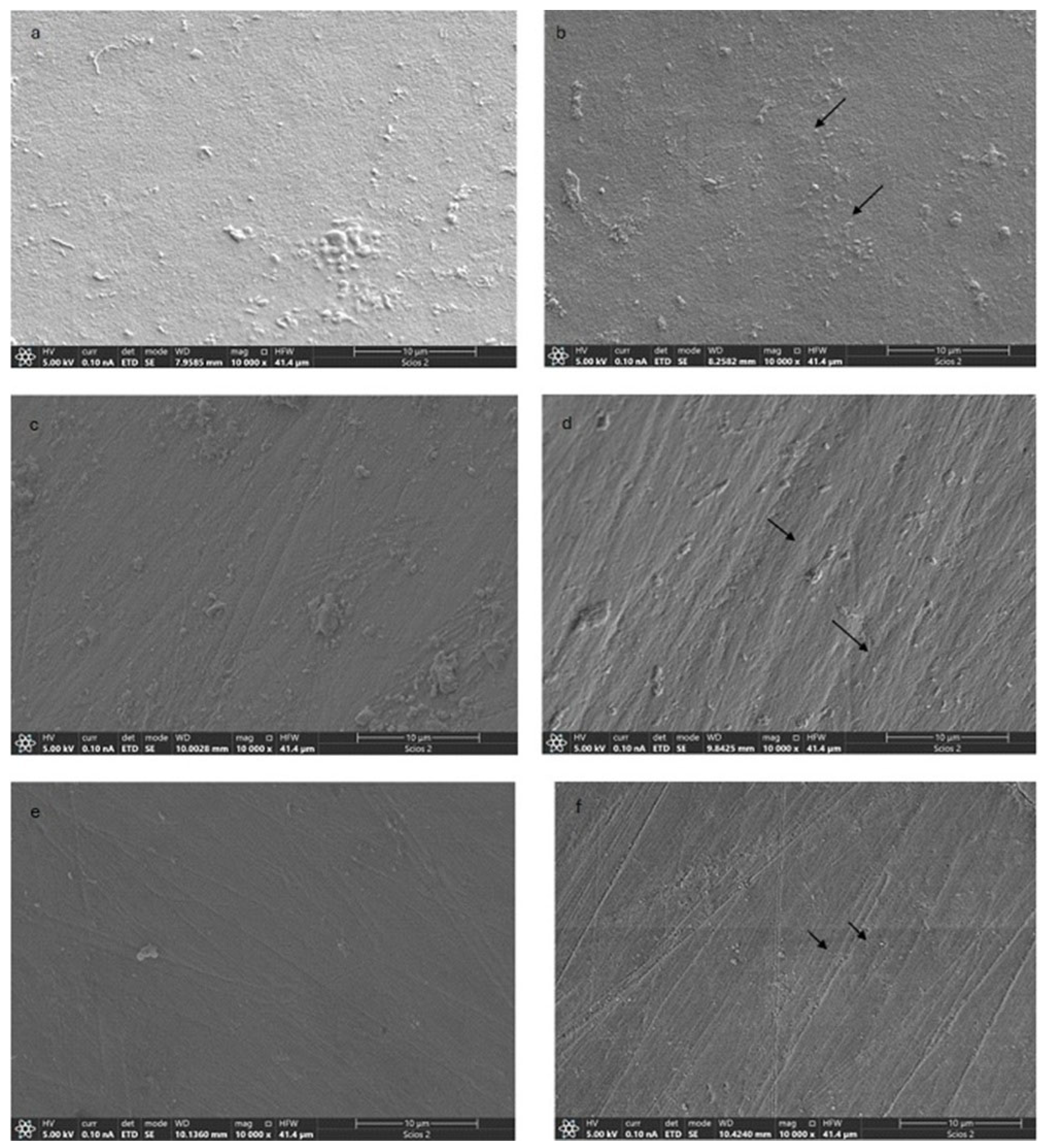 Figure 5f) also demonstrated morphological changes, characterized by increased surface roughness, accentuated linear grooves, and discrete surface defects (indicated by arrows).