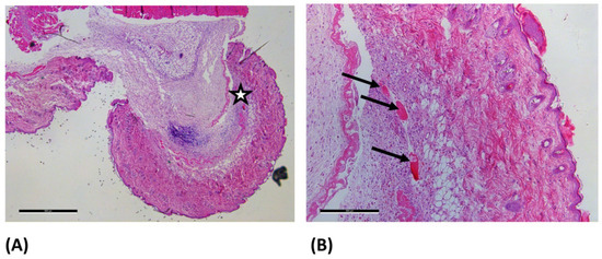Light microscopy images of the ONRC group at day 7 after hematoxylin-eosin staining. (A) 2.5× magnification (scale bar: 500 µm) and (B) 10× magnification (scale bar: 500 µm).The enlarged area is marked with a star (☆) in image (A). In (B) the arrows (→) mark eosinophilic residues, which most likely represent undegraded residues of the used hemostatic agents within the dermis.