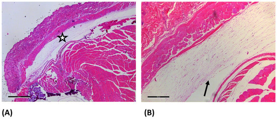 Light microscopy images of GELA group at day 7 after hematoxylin-eosin staining. (A) 2.5× magnification (scale bar: 100 µm) and (B) 10× magnification (scale bar: 100 µm). The enlarged area is marked with a star (☆) in image (A). In figure (B) the arrow (→) marks fibrous structure, which most likely represent yet undegraded gelatinous parts of the material embedded during surgery.