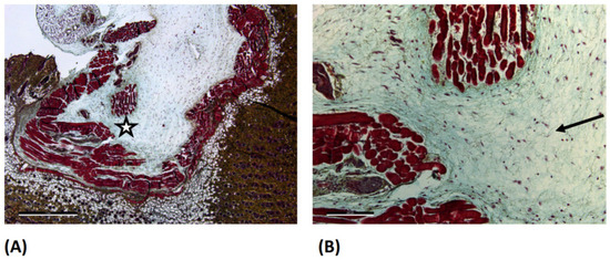 Light microscope images of the OCR group at day 3 after Movat Pentachrome (MP) staining. (A) 2.5× magnification (scale bar: 1 mm) and (B) 10× magnification (scale bar: 200 µm). The magnified area is marked with a star (☆) in image (A). In image (B) the arrows (→) marks pronounced streaks of red fibers which potentially represent an increased myofibroblast deposition and activity.
