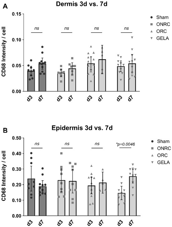 Comparison of difference in CD68 intensity between the 3rd and 7th postoperative day. CD68 intensity after staining are shown for dermis (A) and epidermis (B) compared between the 3rd and 7th postoperative day for each tested material and the control (sham). While no significant difference between days 3 and 7 were observed in the dermis regarding CD68 intensity, a significantly higher CD 68 intensity was observed in the epidermis after 7 days as compared to after 3 days in the GELA group ((B); Δ = 0.107, 95% CI [0.0342; 0.179], 0. p = 0.0046) (ns—not significant, * p < 0.05).