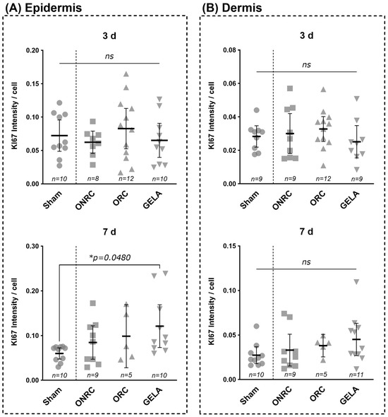 Comparison of difference in KI67 intensity between the 3rd and 7th postoperative day. Results for KI67 intensity after immunohistochemistry staining are shown for dermis (A) and epidermis (B) compared between the 3rd and 7th postoperative day for each tested material and the control (sham). A significant difference between days 3 and 7 was observed for the GELA group with a higher KI67 intensity at the 7th postoperative day both in der dermis ((A); Δ = 0.020, 95% CI [0.005; 0.035], p = 0.0117) and the epidermis ((B); Δ = 0.056, 95% CI [0.017; 0.095], p = 0.0052) (ns—not significant, * p < 0.05).