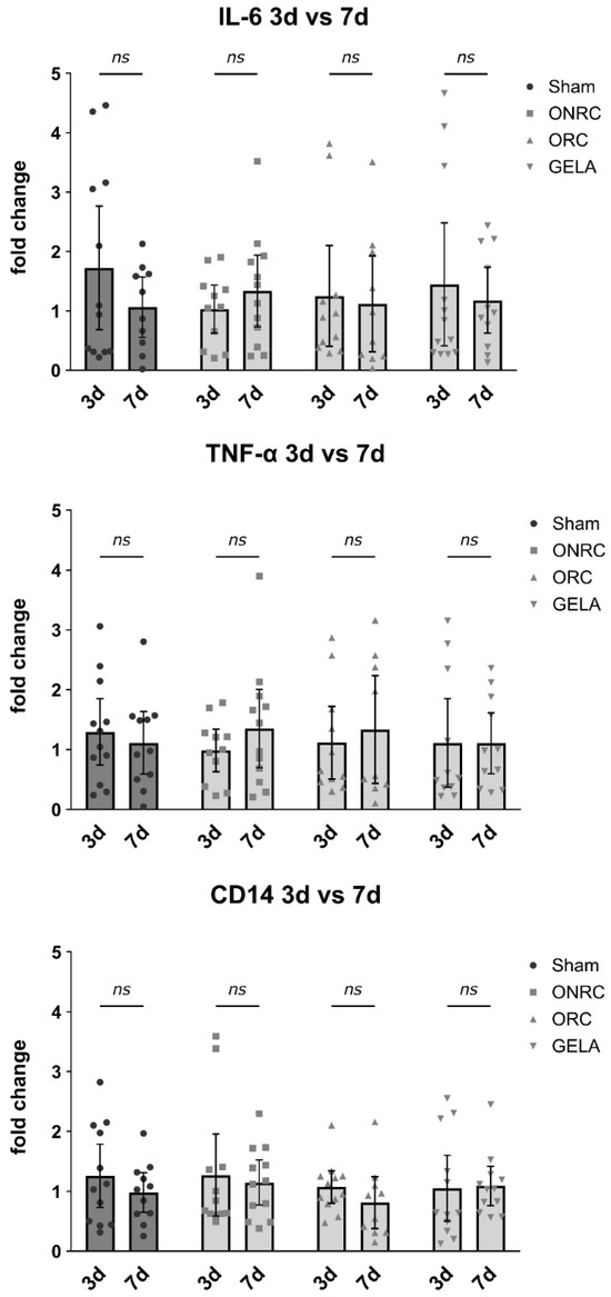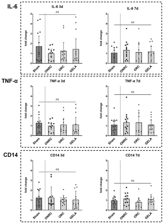 Comparison of difference in inflammatory marker levels between the 3rd and 7th postoperative day. Results for IL-6, TNF-α and CD14 levels measured via qPCR compared between the 3rd and 7th postoperative day for each tested material and the control (sham). No statistically significant difference was observed for either marker between days 3 and 7 for the investigated groups (ns—not significant).
