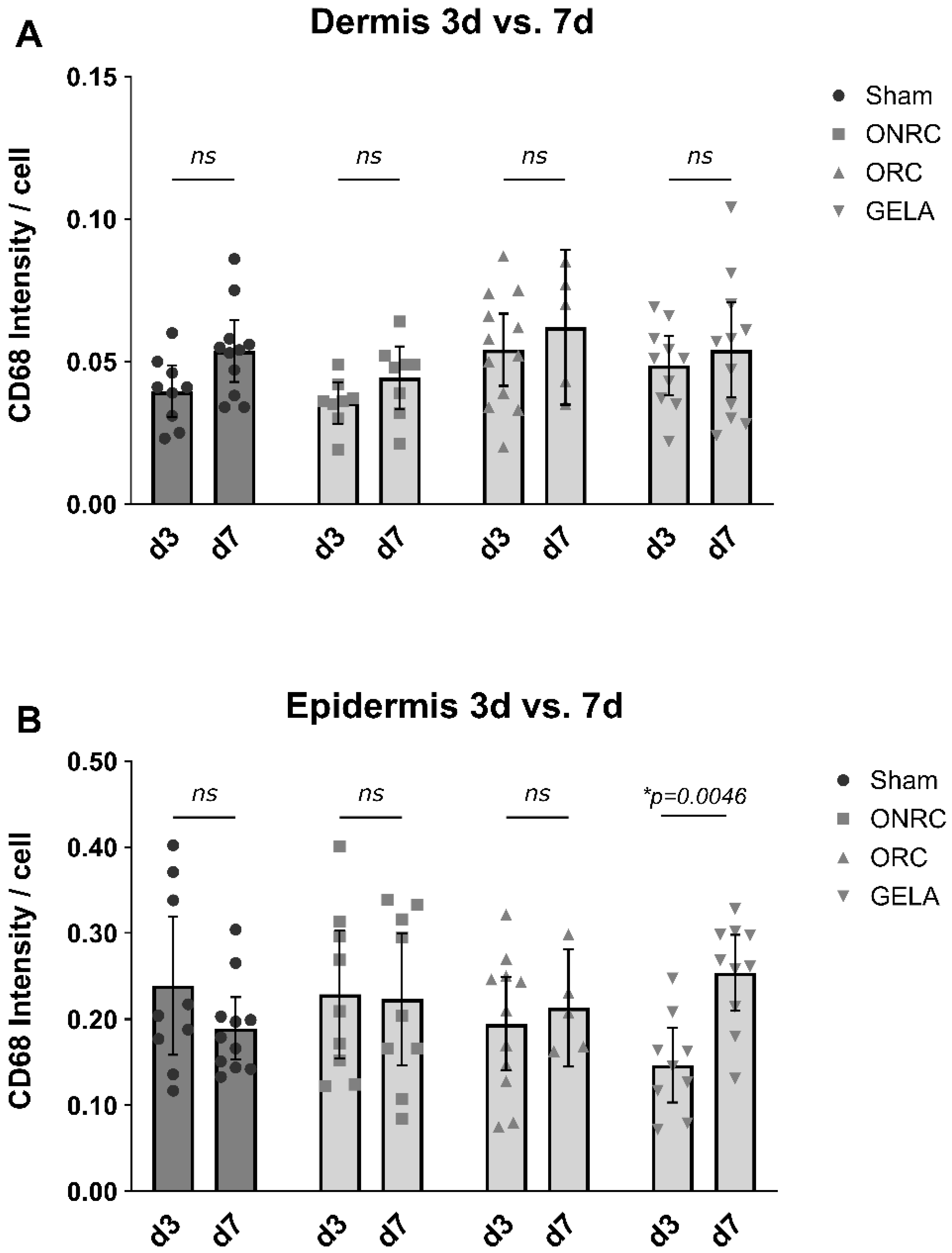 | CD68 | Epidermis | 7 d | 0.178 ± 0.040 | n.s. | n.s. | 0.267 ± 0.046 * |