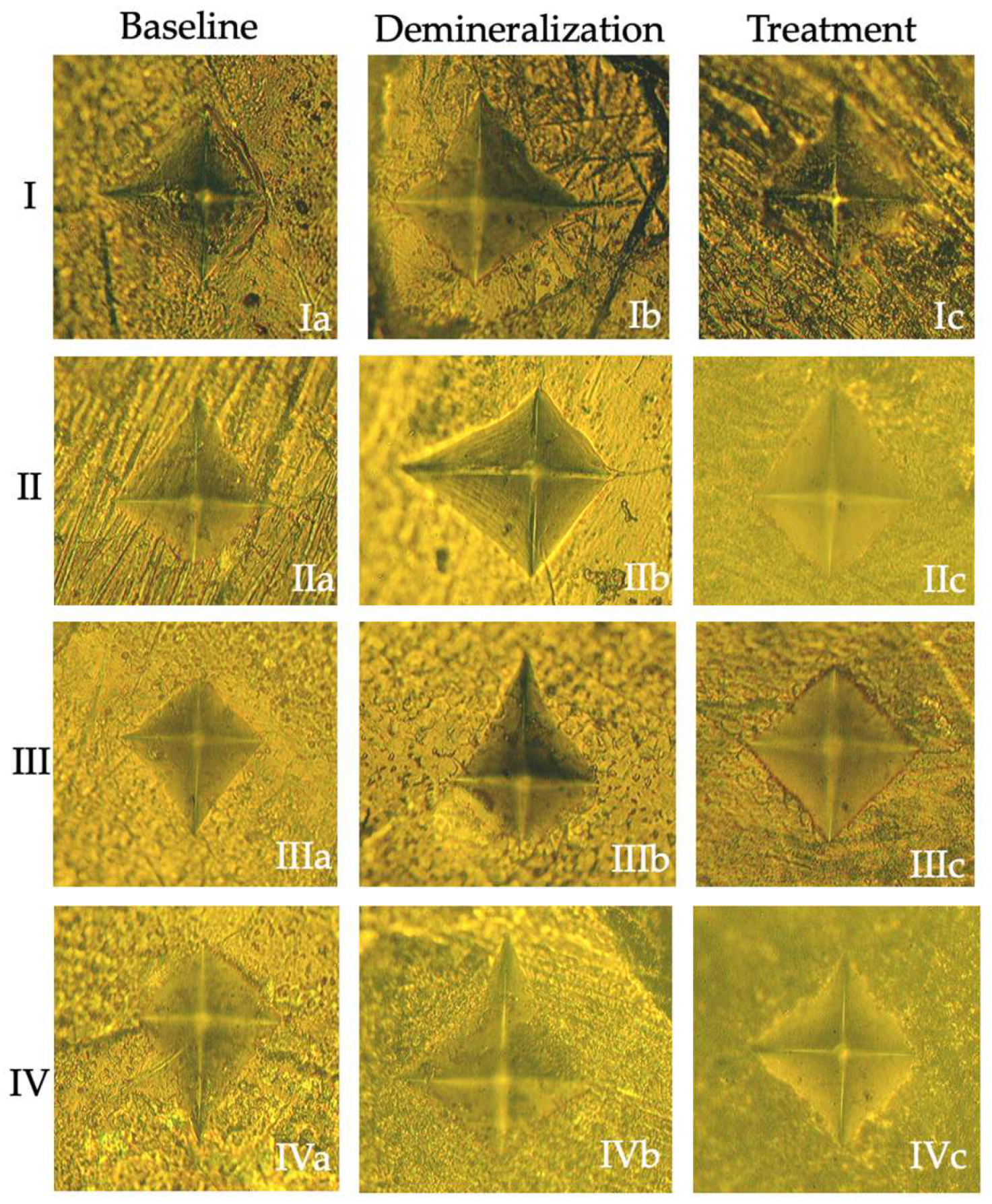 Figure 1. Representative microhardness indentation images of the groups. Baseline (IaIVa), demineralization (IbIVb), and treatment (IcIVc) conditions are shown for Groups I–IV.