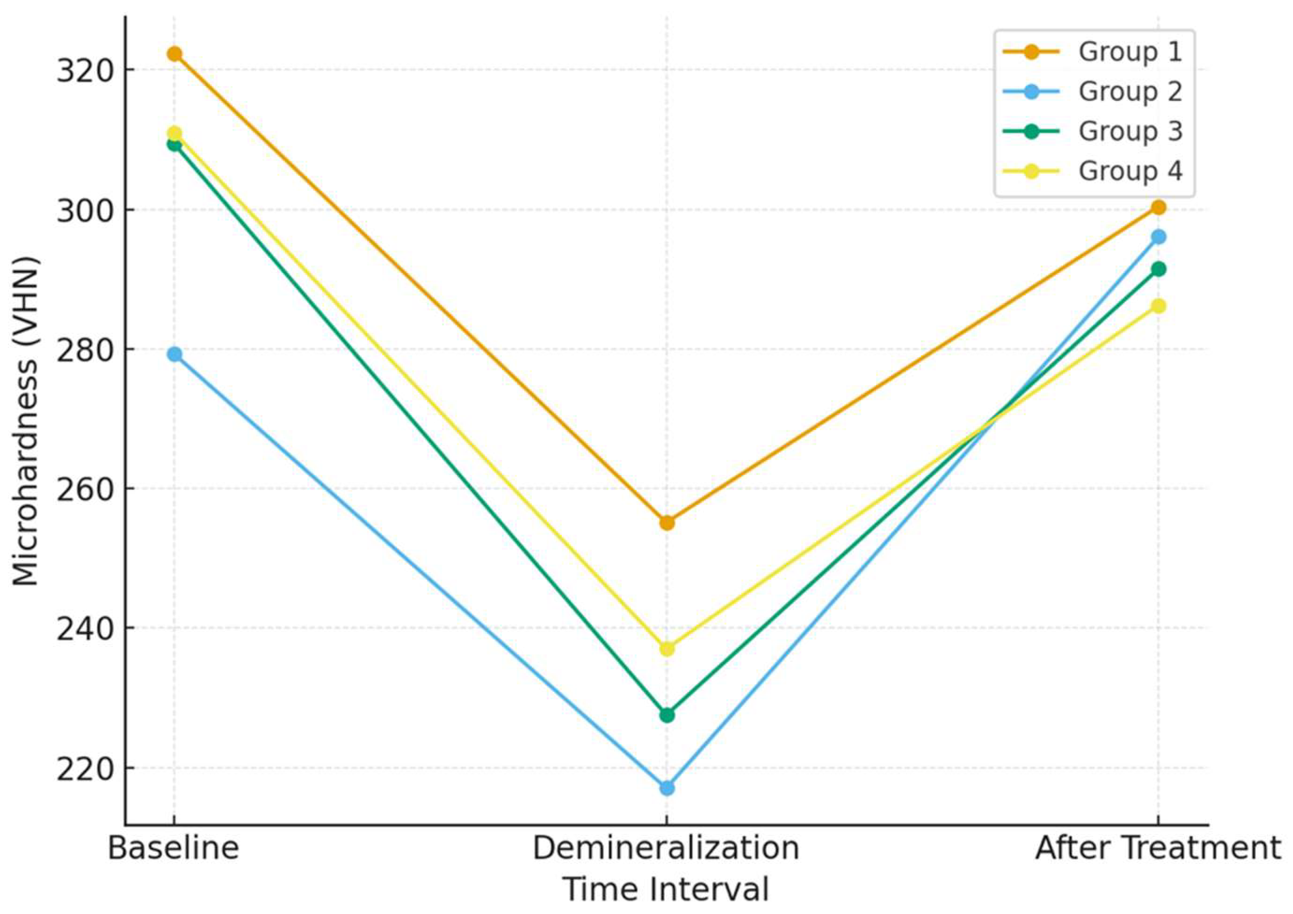 After resin infiltration, a partial recovery in surface microhardness was observed across all groups compared with the demineralized state. However, none of the experimental groups, with the exception of Group 2, reached baseline microhardness values, indicating incomplete mechanical recovery. No statistically significant differences were detected between the groups at any measurement time point, and the interaction effect between time and group (time × group) was also not significant, suggesting a similar microhardness response pattern for all resin systems and pretreatment protocols.