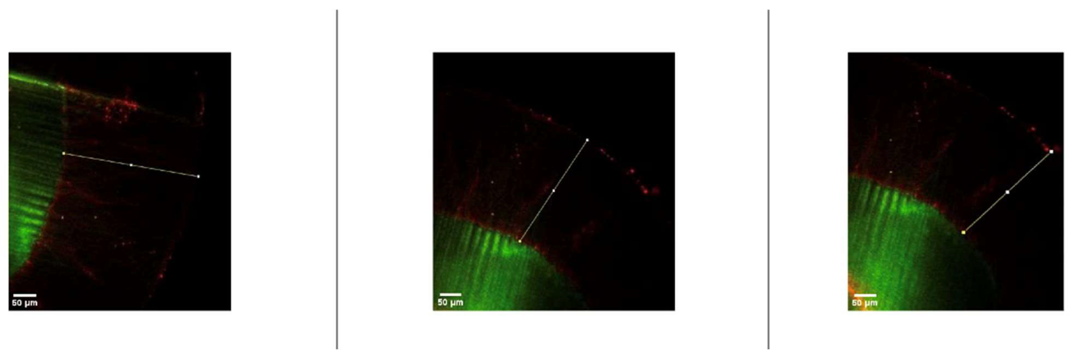 Representative confocal laser scanning microscopy images illustrating resin penetration depths assessed using the dual-fluorescence staining technique are presented in Figure 3 and Figure 4.