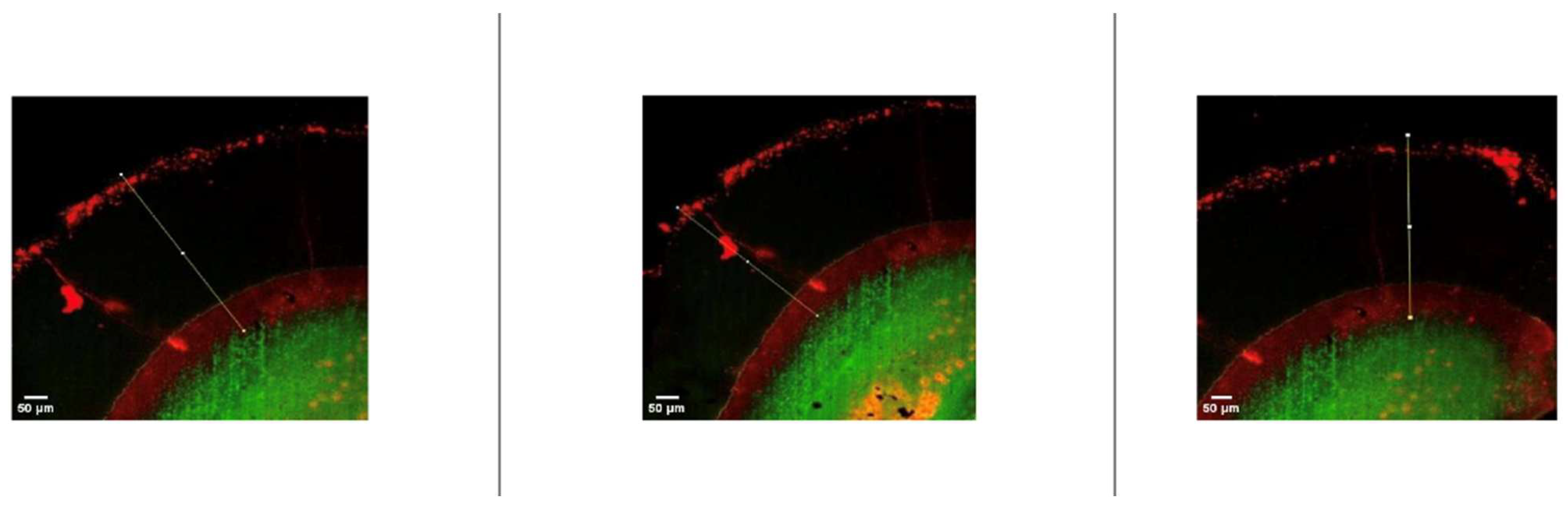 In addition to mechanical assessment, the evaluation of resin penetration depth within enamel lesions provides critical insight into the effectiveness of resin infiltration therapy. Confocal laser scanning microscopy (CLSM), combined with dual-fluorescence staining techniques, enables clear differentiation between infiltrated and non-infiltrated regions within the lesion body. Following resin infiltration, infiltrated areas become impermeable to secondary dyes, whereas non-infiltrated porous zones remain stained, allowing for precise visualization and semi-quantitative assessment of penetration depth [14,17].