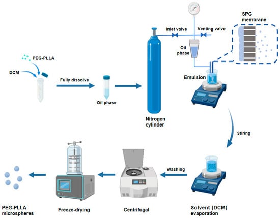 The PEG-PLLA MSs were fabricated by membrane emulsification. As shown in Figure 1, we accurately weighed 0.4 g of PEG-PLLA and dissolved it in DCM to form the oil phase. Subsequently, the oil phase was injected into the PVA solution through an SPG membrane tube with a uniform pore size of 15 μm using the membrane emulsification device, obtaining a PEG-PLLA MS suspension. The MS suspension was magnetically stirred at room temperature for 12 h to accelerate dichloromethane removal. Subsequently, the solidified MSs were collected and washed, followed by lyophilization to obtain the PEG-PLLA MS powder.