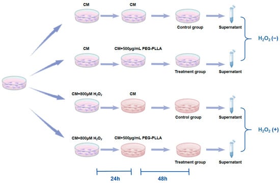 To assess the secretion of Col-I and Col-III, an ELISA was performed. The grouping of cells and treatment regimens were shown in Figure 2. L929 fibroblasts were categorized into two groups: normal cells and oxidative stress-treated cells. Normal cells (normal group) were obtained by culturing normal L929 fibroblasts in complete medium (CM) for 24 h. To induce cellular oxidative stress, L929 cells were treated with CM containing 800 μM H2O2 for 24 h (oxidatively stressed group). Subsequently, both normal and oxidatively stressed cells were incubated with PEG-PLLA MS suspension (500 μg/mL) for 48 h. Control groups for both cell types were cultured in CM without MSs for the same period. After treatment, culture supernatants were collected and centrifuged at 15,000× g for 5 min. The concentrations of Col-I and Col-III in the supernatant were then quantified using a commercial ELISA kit. Absorbance was measured at 450 nm with a Varioskan LUX microplate reader.
