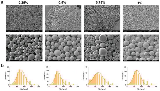 Based on the superior morphology and particle size distribution of the MSs, a PEG-PLLA concentration of 40 mg/mL was selected. Following this, we next optimized the concentration of PVA in the external aqueous phase (0.25%, 0.5%, 0.75%, and 1%) to assess its influence on MS formation. The corresponding results were presented in Figure 4 and SEM micrographs revealed that MSs were formed at all PVA concentrations tested. However, surface adhesion was observed at PVA concentrations of 0.75% and 1%. Particle size analysis showed that the volume proportion of MSs within the target range of 30–60 μm was 60%, 65%, 62%, and 58% for the 0.25%, 0.5%, 0.75%, and 1% PVA groups, respectively. Among these, MSs prepared with 0.5% PVA exhibited the highest proportion of particles in the desired size range. They also met the criteria of a relatively small average particle size (64.567 ± 2.34 μm) and a uniform distribution (SPAN = 1.68 ± 0.09; D10 = 16.682 ± 1.25 μm; D90 = 125.155 ± 4.12 μm). Therefore, 0.5% was selected as the optimal PVA concentration for the external aqueous phase.