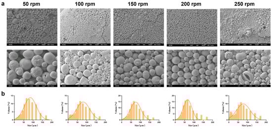 Magnetic stirring speed significantly affects the physicochemical properties of MSs during preparation. After investigating the optimal PEG-PLLA concentration, we systematically evaluated how different stirring speeds (50, 100, 150, 200, and 250 rpm) influenced the physicochemical properties of the MSs. Based on the SEM results (Figure 5a), as the magnetic stirring speed increased, the physicochemical properties of MSs gradually improved. However, high shear forces caused droplet breakup and extensive fragmentation at 250 rpm. Particle size distribution showed that the volume fraction within 30–60 μm were 65%, 60%, 68%, 70%, and 55% for 50, 100, 150, 200, and 250 rpm, respectively (Figure 5b). Experimental results indicated that increasing the stirring speed generally reduced particle size and improved MS morphology. Nonetheless, excessively high speeds caused overshearing, which disrupted the newly formed droplets and reduced MS uniformity. MSs prepared at 200 rpm exhibited optimal morphology, a small average size (59.324 ± 2.15 μm), and a narrow distribution (SPAN = 1.586 ± 0.08; D10 = 18.972 ± 1.32 μm; D90 = 113.06 ± 3.87 μm). This condition also yielded the highest proportion of particles in the target size range. Therefore, 200 rpm was selected for subsequent experiments.