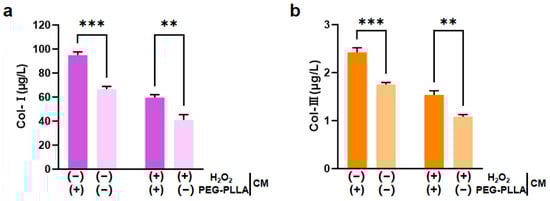 L929 fibroblasts are key functional cells responsible for synthesizing and secreting ECM components. Under stimulation by relevant molecular signals, these cells can further regulate the expression of collagen genes, including types I and III; this regulatory effect is crucial for imparting mechanical strength and elasticity to the ECM [17,18]. Therefore, this study employed H2O2 to induce oxidative damage in L929 cells. H2O2 exposure triggered a substantial increase in intracellular reactive oxygen species (ROS), leading to cellular oxidative stress. The secretion levels of both Col-I and Col-III were significantly lower in H2O2-treated cells compared to untreated controls. This confirmed that oxidative impairment reduced the collagen-secreting capacity of the cells. Treatment with PEG-PLLA MSs increased Col-I and Col-III secretion in both the normal group and the oxidatively stressed group. In normal cells, the increase was approximately 1.5-fold (p < 0.001). In the cells under oxidative stress, levels increased approximately 1.45-fold (p < 0.01). This indicated that PEG-PLLA MSs can enhance collagen production not only under normal conditions but also in a state of oxidative injury (Figure 9). Notably, the stimulatory effect of PEG-PLLA MSs on collagen regeneration was more pronounced in normal cells than in oxidative stress-treated cells (p < 0.001). These results indicated that the PEG-PLLA MSs not only enhance collagen secretion in normal fibroblasts but also restore the collagen synthesis function of cells under oxidative stress.
