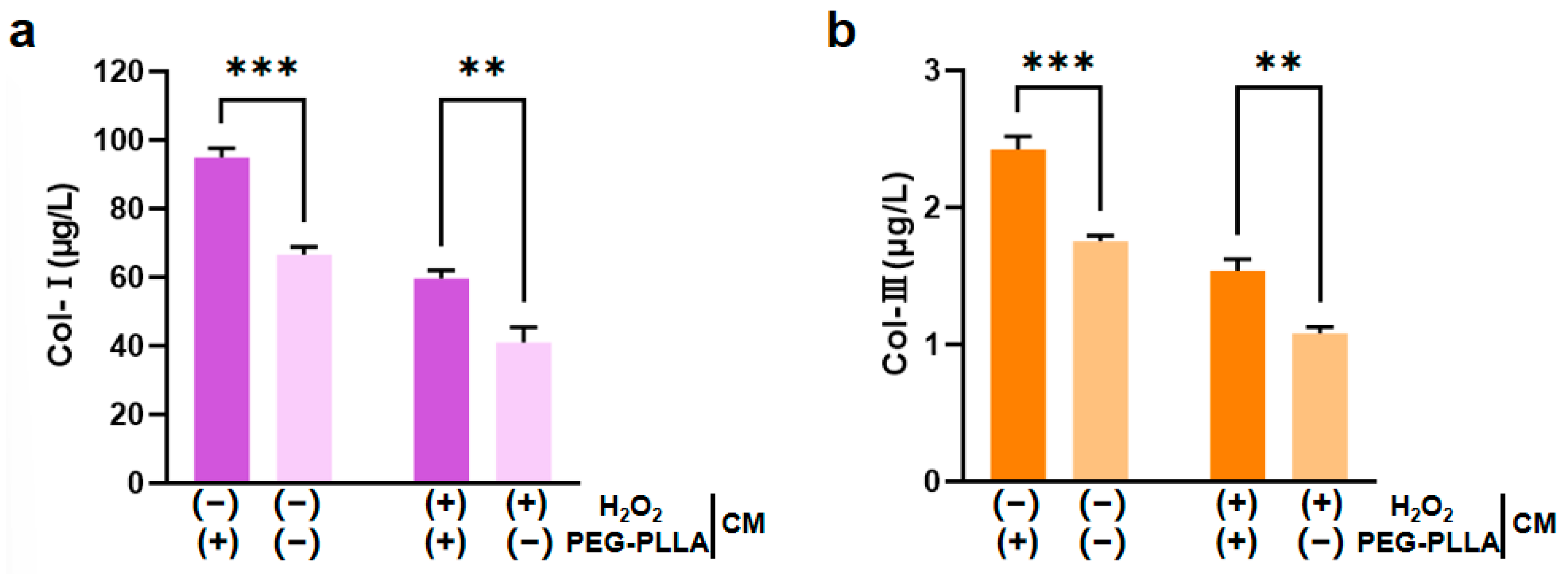 3.5. The Effect of PEG-PLLA MSs on the Content of Col-I and Col-III