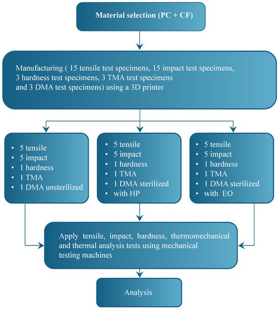 To address this knowledge gap, the present study investigates the effects of EO and HP sterilization on the mechanical, thermal, and morphological behavior of PC-CF specimens fabricated by FDM. It is hypothesized that sterilization may induce physicochemical changes capable of altering the performance of the material. Accordingly, a full characterization was conducted before and after sterilization, including tensile, impact, and hardness tests; thermomechanical analysis (TMA); and microstructural evaluation.