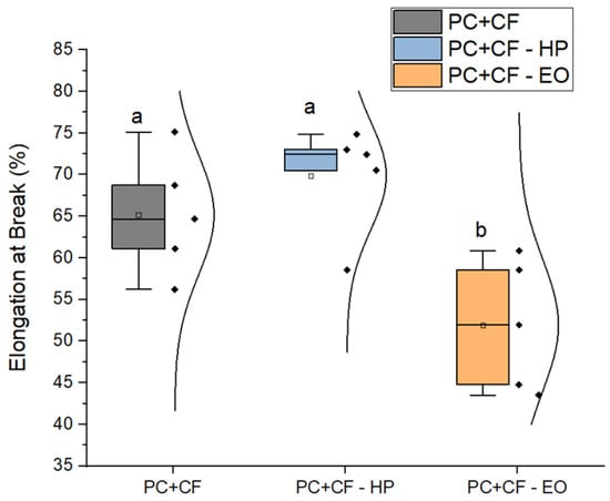 Elongation at break of PC-CF specimens under different sterilization conditions. Square markers represent mean values, and individual data points are overlaid for each group. Different letters indicate statistically significant differences between groups (), according to Tukey’s pairwise comparison: groups sharing the same letter (a) are not significantly different, whereas groups labeled with different letters (b) show statistically significant differences.