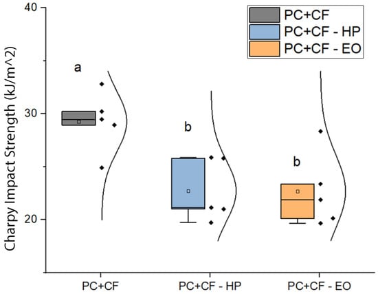 Charpy impact resistance of PC-CF specimens before and after sterilization. Square markers represent mean values, and individual data points are overlaid for each group. Different letters indicate statistically significant differences between groups (), according to Tukey’s pairwise comparison: groups sharing the same letter (a) are not significantly different, whereas groups labeled with different letters (b) show statistically significant differences.