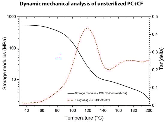 Dynamic Mechanical Analysis (DMA) of unsterilized PC-CF: storage modulus () and damping factor (tan()) as a function of temperature.