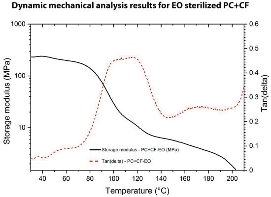 DMA results for EO-sterilized PC-CF: storage modulus () and tan() as a function of temperature.