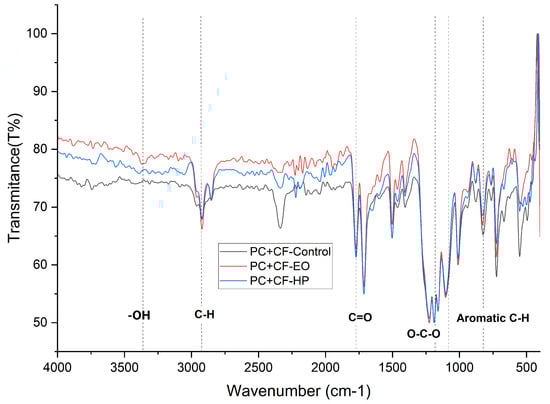 This section analyzes the chemical behavior of FDM-printed polycarbonate reinforced with carbon fiber (PC+CF) using Fourier Transform Infrared Spectroscopy (FTIR), with the objective of identifying the characteristic absorption bands of the polycarbonate matrix and detecting possible chemical modifications after sterilization with hydrogen peroxide (HP) and ethylene oxide (EO). The FTIR spectra obtained for the different treatment conditions are presented in Figure 13.