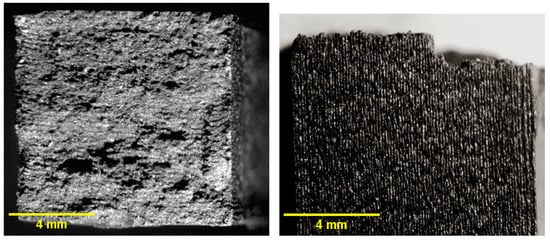 Fracture surfaces of unsterilized PC–CF under stereomicroscopy: (left) top view of the cross-section; (right) front view.