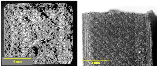 Fracture surfaces of HP-sterilized PC–CF: (left) top view of the cross-section; (right) front view.
