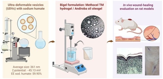 The development of effective topical drug delivery systems remains a key challenge in wound management, particularly for bioactive compounds with limited skin permeability. In this study, a nanostructured bigel system incorporating sodium humate-loaded ultra-deformable vesicles (UDVs) was developed and evaluated for wound healing applications. Sodium humate-loaded UDVs were prepared using a thin-layer hydration method, and the influence of key technological parameters (phospholipid/glycerol concentrations, sonication time) on vesicle size and encapsulation efficiency was investigated. An optimized UDV formulation characterized by small particle size, high stability, and high drug encapsulation efficiency was selected and incorporated into a bigel composed of hydroxypropyl methylcellulose hydrogel and andiroba oil oleogel. The developed bigels were characterized in terms of microstructure, physical stability, pH, spreadability, and rheological behavior, demonstrating suitable properties for dermal application. In vivo wound healing evaluation in rat wound models revealed that bigels containing sodium humate-loaded UDVs significantly enhanced wound closure and tissue regeneration compared to control and reference treatments. Histopathological analysis confirmed improved granulation tissue formation and complete epithelialization. Overall, the results demonstrate that the proposed UDV-loaded hybrid bigel represents a promising nanostructured platform for enhanced dermal delivery and wound healing therapy.