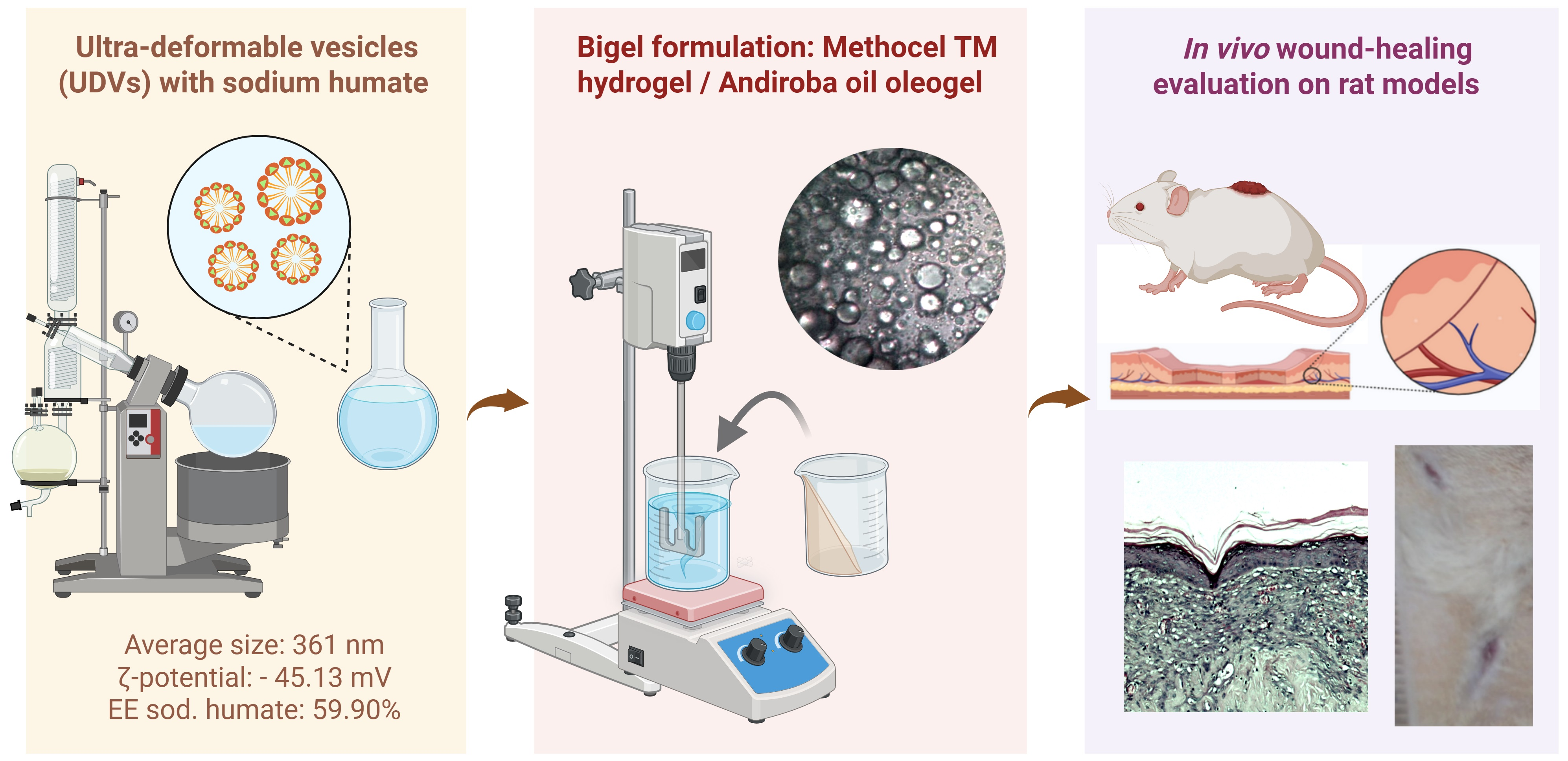 The aim of the present study was to develop and evaluate a novel nanostructured hybrid bigel system incorporating sodium humate-loaded ultra-deformable vesicles (UDVs) for enhanced dermal delivery and wound healing therapy. Specifically, the work focused on the formulation and optimization of sodium humate-loaded UDVs with small particle size and high encapsulation efficiency, followed by their incorporation into a hybrid bigel matrix designed to provide effective topical performance. The wound healing efficacy of the developed system was further assessed in vivo to demonstrate its therapeutic potential.