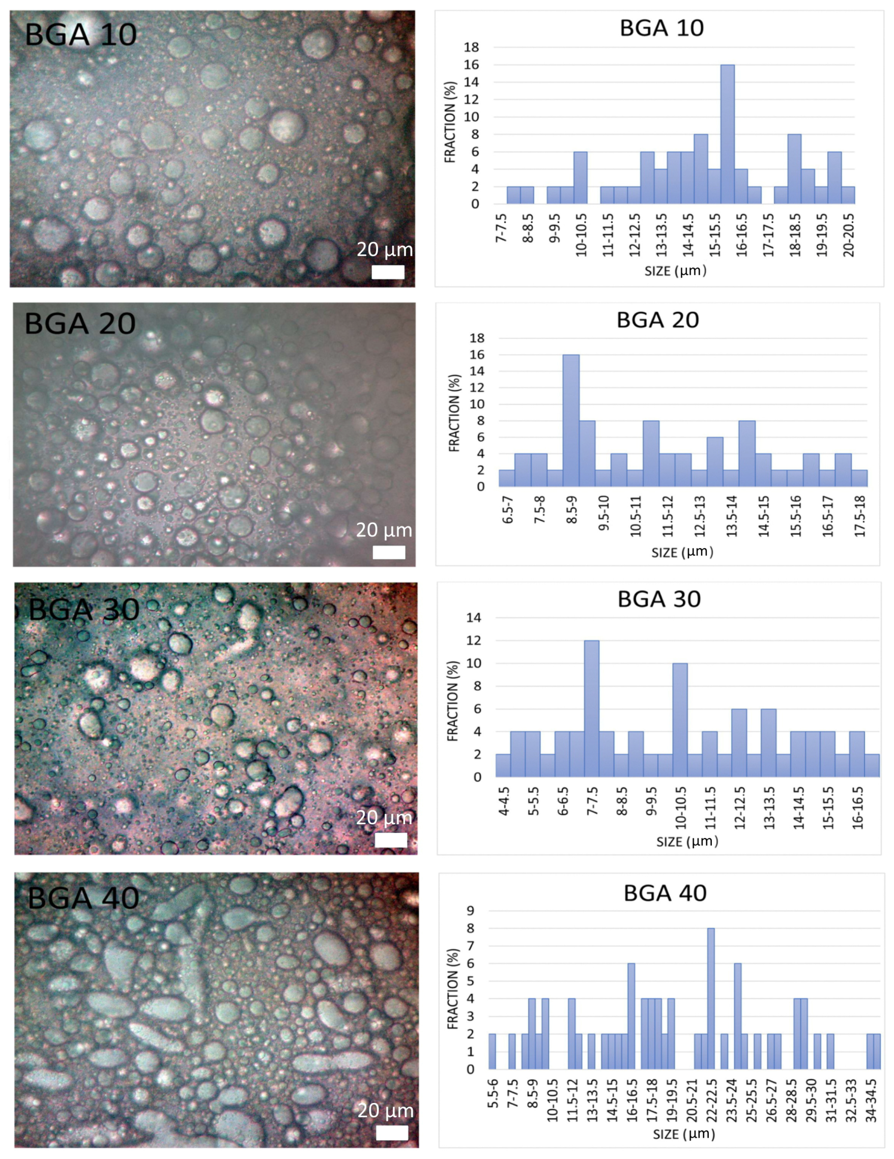 The droplet size distributions for these three formulations were relatively narrow, ranging from 7.5 to 20.5 µm (BGA10), 6.5 to 18 µm (BGA20), and 4 to 17 µm (BGA30) (Table 5). In contrast, the formulation containing 40% oleogel (BGA40) showed a significant increase in both mean droplet diameter (19.37 µm) and size distribution range (5.5–34.5 µm).