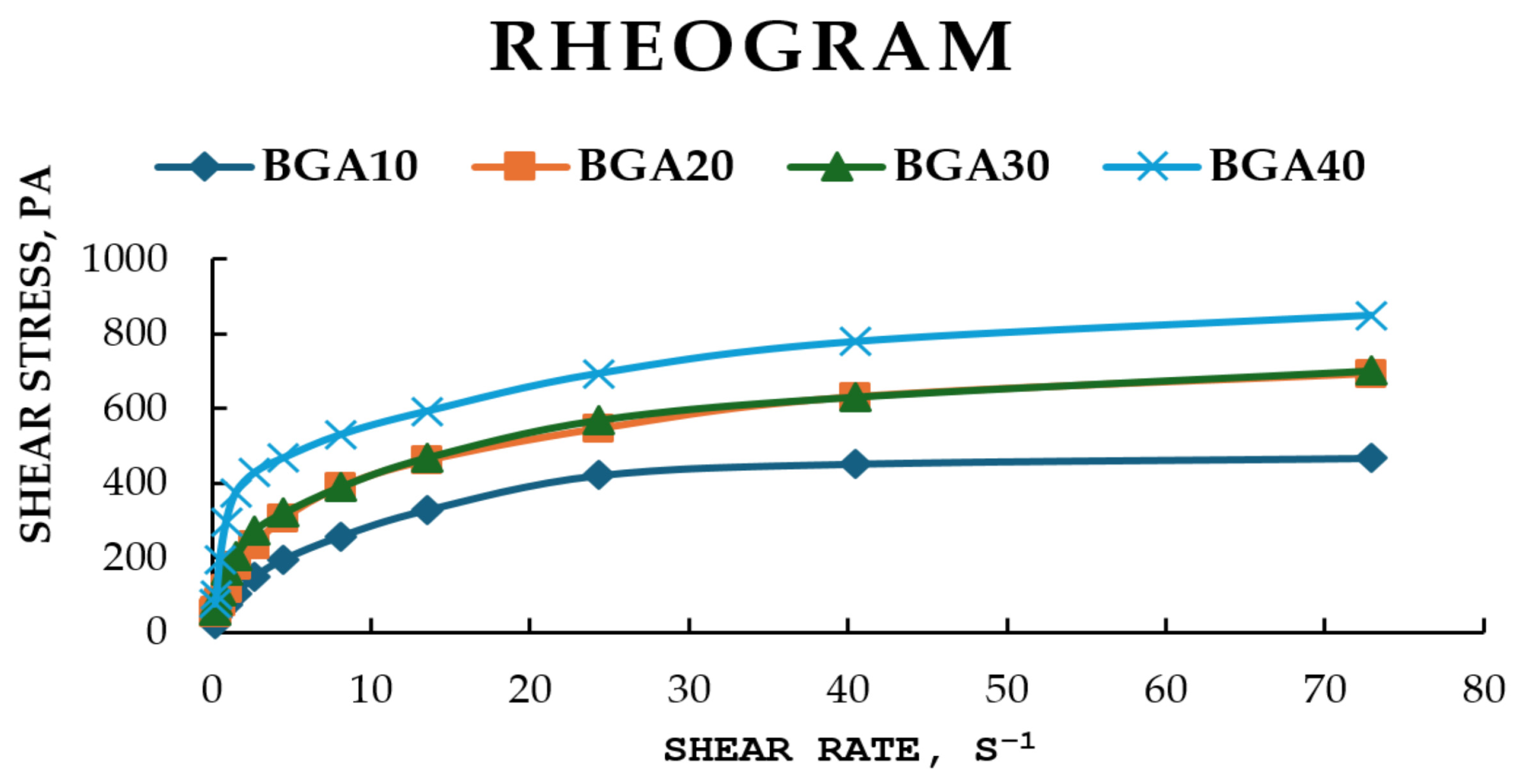 Figure 3. Rheograms at a temperature of 25 °C, sample type: BGA10, BGA20, BGA30, BGA40.