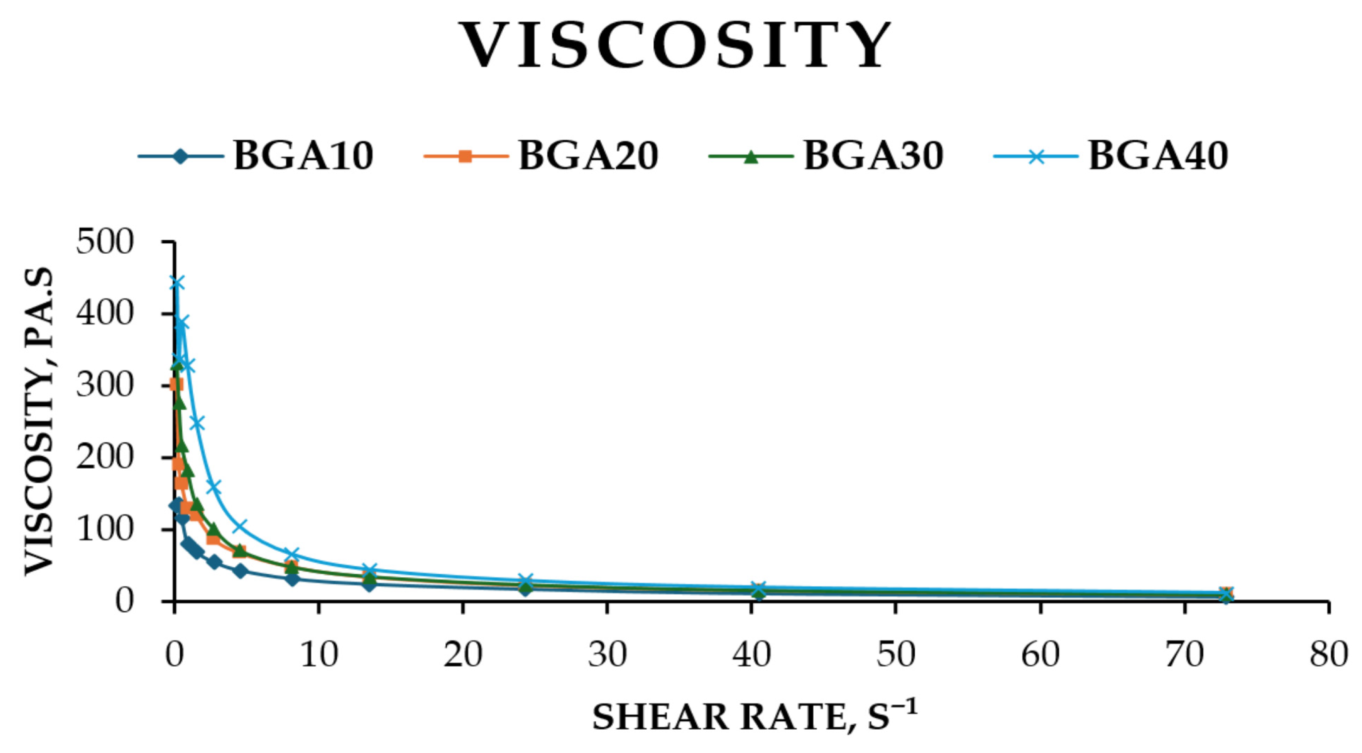 Figure 4. Viscosity of samples depending on the shear rate at a temperature of 25 °C, sample type: BGA10, BGA20, BGA30, BGA40.