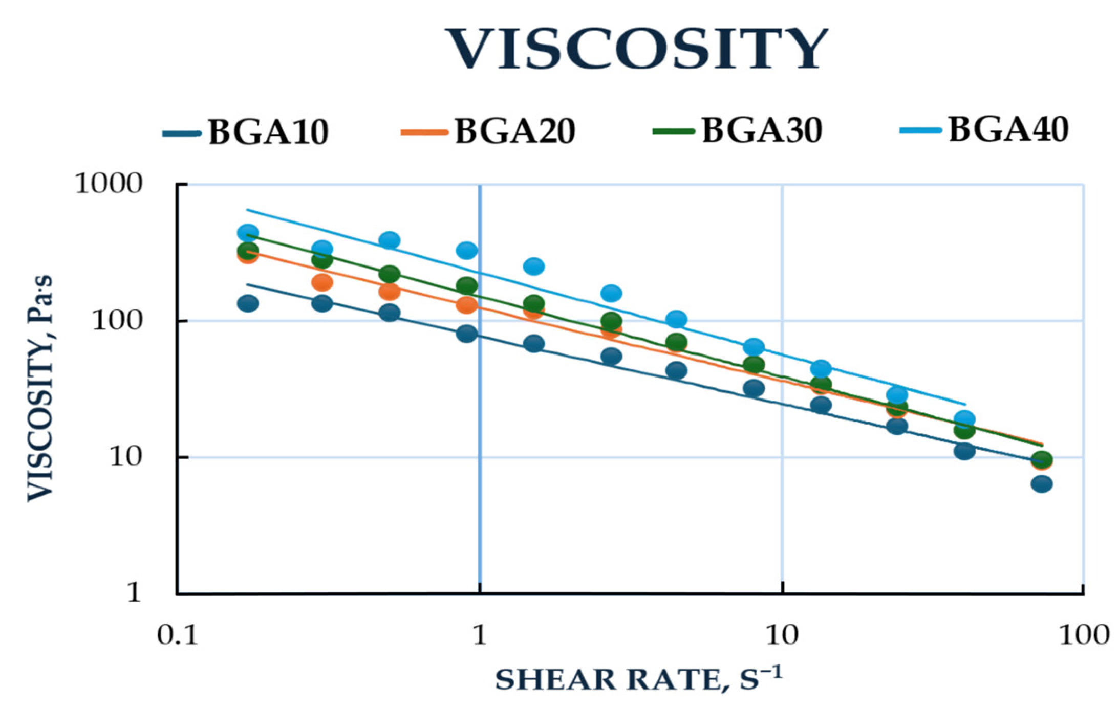 Figure 5. Viscosity of samples depending on the shear rate in logarithmic coordinates, sample type: BGA10, BGA20, BGA30, BGA40.