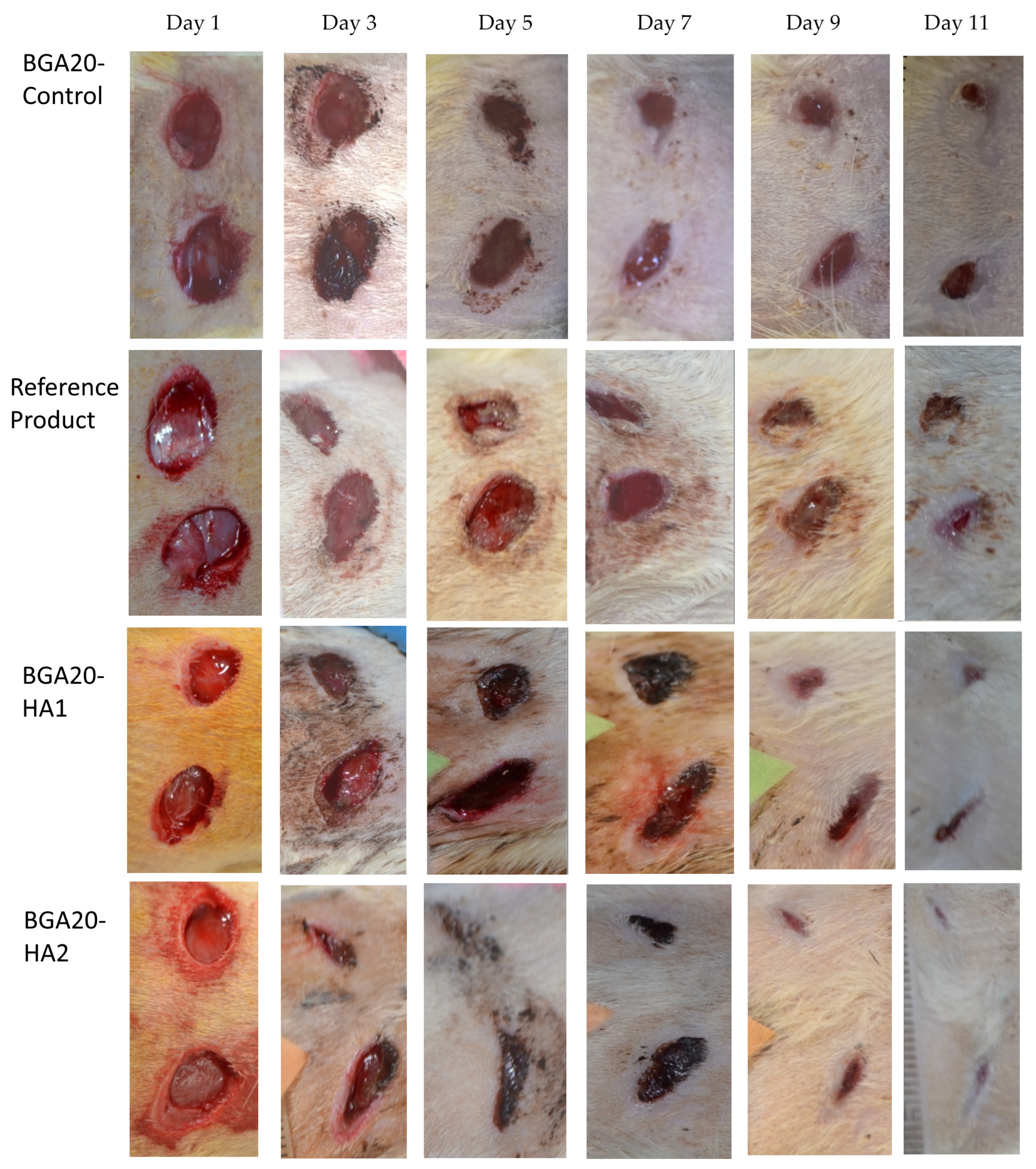 Figure 7. Macroscopic evaluation of wound contraction during treatment with bigel formulations without sodium humate (BGA20Control), the reference product (Herbal wonder®), bigels with sodium humate-loaded UDVs: sodium humate concentration in the bigel 1% (BGA20HA1), and 2% (BGA20HA2).