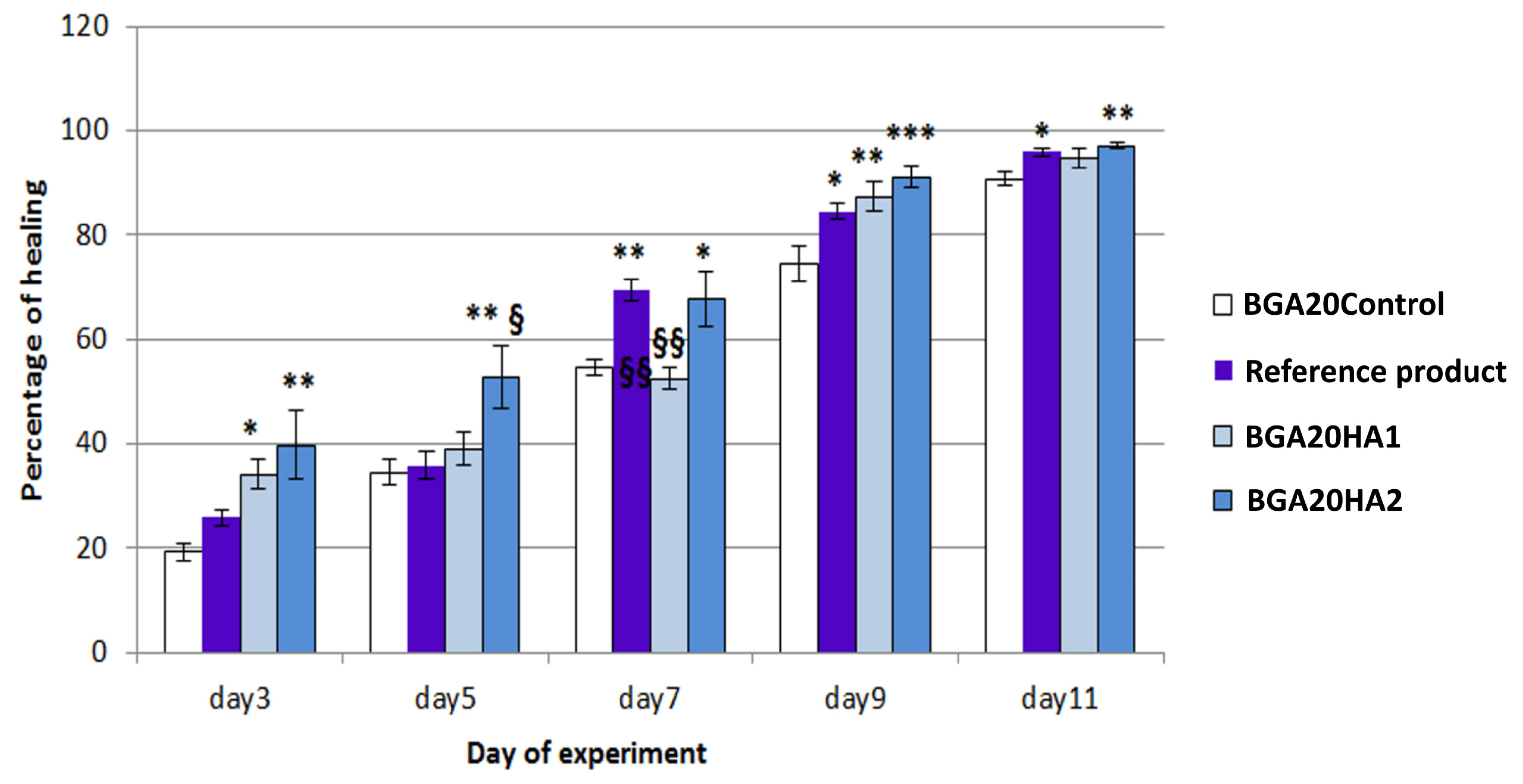 Figure 8. Changes in the percentage of wound healing after treatment with bigel formulations. Data are presented as mean ± SEM. The symbol * indicates p ≤ 0.05 vs. the control group on the same day; ** indicates p ≤ 0.01 vs. the control group on the same day; *** indicates p ≤ 0.001 vs. the control group on the same day; § indicates p ≤ 0.05 vs. the reference product group on the same day; §§ indicates p ≤ 0.01 vs. the reference product group on the same day.