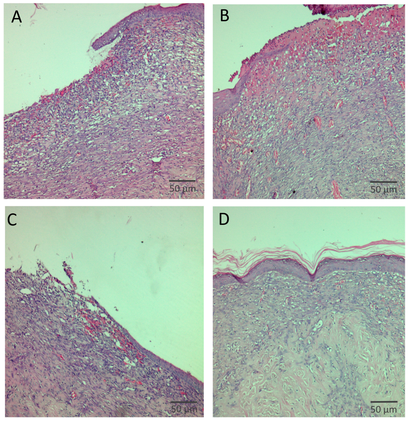 Figure 9. Histological examination of skin epithelization on day 11: Panel (A)—treatment with BGA20Control.; panel (B)—treatment with reference product; panel (C)—treatment with BGA20HA1; panel (D)—treatment with BGA20HA1. Staining: hematoxylin and eosin; Magnification 400×.