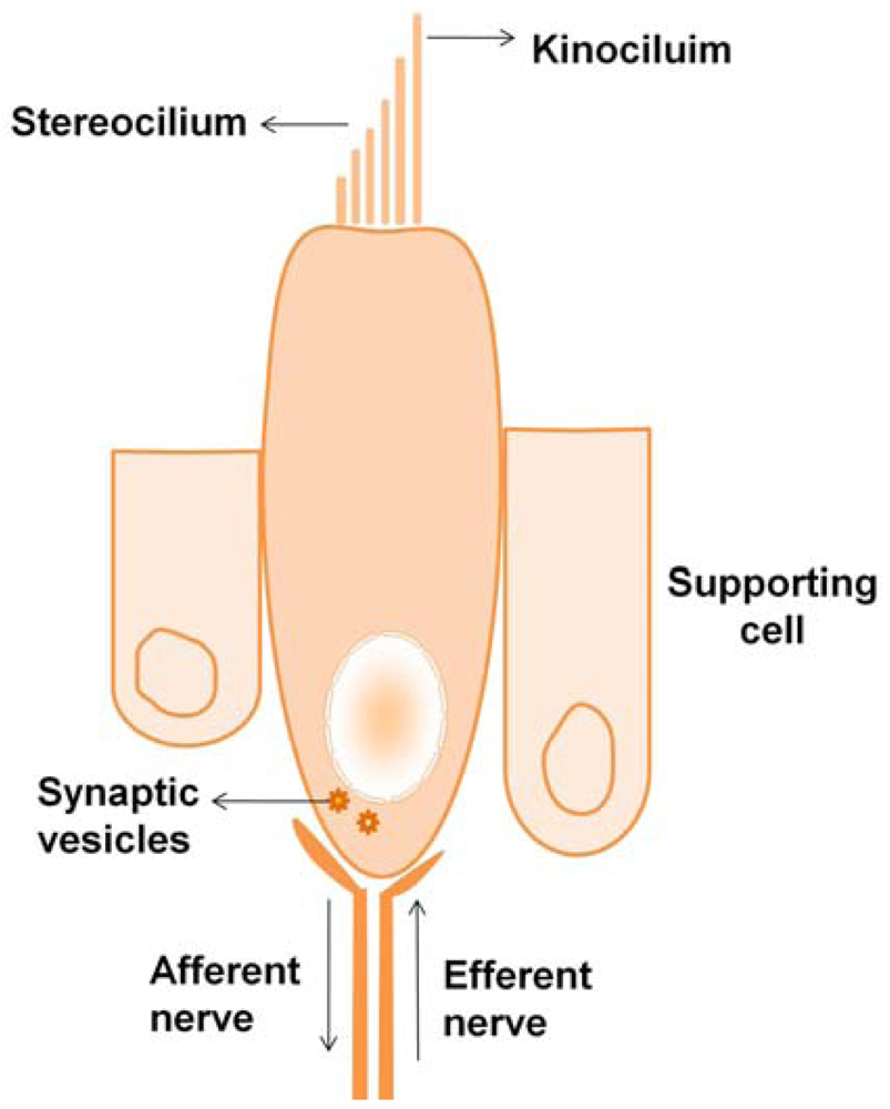 The kinocilium of cochlear hair cells in mammals degenerates a few weeks after birth [36,37,38,39,40]. Hair cells form synaptic connections from neurons at the basal end and terminate in the cochlear or vestibular nuclei of the brainstem. The term “mechanoreceptors” comes from their participation in transforming mechanical energy to electrical energy. In the auditory system, the mechanical energy occurs in the form of a wave and the hair cells are stimulated as the tectorial membrane shears against the organ of corti, whereas in the vestibular system, the mechanical energy is a result of displacement of hair cells due to the force of gravity or inertia.
