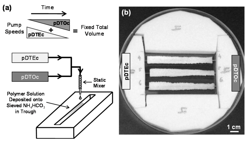 A two-syringe pump approach (Figure 1) for fabricating salt-leached scaffold gradients was adapted herein to fabricate gas-foamed scaffold gradients. To demonstrate the approach, two different polymers, pDTEc and pDTOc, were used (Figure 2) to fabricate the gas-foamed scaffold libraries. Three pDTEc/pDTOC gas-foamed scaffold gradients made by the 2-syringe pump approach are shown in Figure 1b. Each gradient was 75 mm long, 8 mm wide and 3 mm deep. The scaffold gradients were mounted in a Teflon rig in a large petri dish. The wires that ran the length of the gradients are visible at the ends of the gradient and were used to suspend the scaffolds in the dish so that they could be used for cell culture experiments.