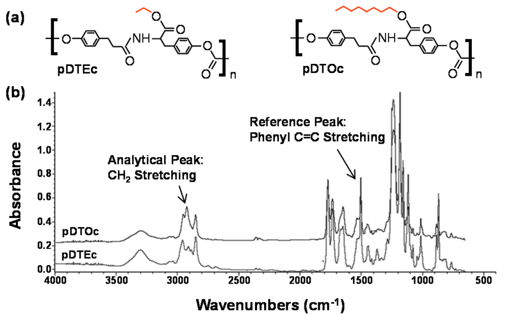 (a) Chemical structure of poly(desaminotyrosyl-tyrosine ethyl ester carbonate) (pDTEc) and poly(desaminotyrosyl-tyrosine octyl ester carbonate) (pDTOc); (b) FTIR spectra for pDTEc and pDTOc after baseline deduction and normalization to maximum absorbance.