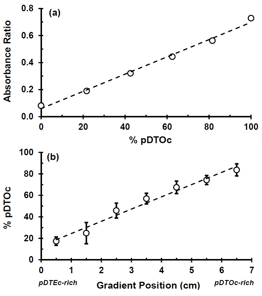 (a) Calibration plot of FTIR peak absorbance ratios (2,927 cm−1: 1,508 cm−1) for known control mixtures of pDTEc and pDTOc. The dashed line is a linear fit(y = 0.0064x + 0.0596) with Pearson correlation coefficient (R) of 0.99; (b) Plot of pDTOc content in the different segments of the gradient scaffolds (error bars are standard deviation, n = 3). The slope of the linear fit (dashed line) is significantly greater than zero (t-test, p < 0.05) with a Pearson correlation coefficient (R) of 0.98.