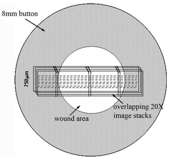 After labeling the cells, fluorescent (for f-actin and nuclei) and reflected light (for collagen) 3-D optical section images were acquired simultaneously using laser confocal microscopy (Leica SP2, Heidelberg, Germany). Stacks of optical sections (z-series) were acquired by changing the position of the focal plane in 4 μm steps for a 20× objective (non-immersion, 0.7 NA, 590 μm free working distance) or 1μm steps for a 63× objective (water immersion, 1.2 NA, 220 μm free working distance). Overalapping image stacks were collected across the entire wound area, as shown in Figure 1.