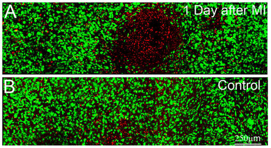 Maximum intensity projection images (~50 microns thick) of Live/Dead staining after 1 day of culture following freeze injury using sandwich construct. Live cells are labeled green and dead cells are labeled red. (A) 1 day after freeze injury, induced by pushing on the surface of the matrix using a cold 3 mm diameter probe; (B) 1 day control sample, in which a room temperature probe was used.