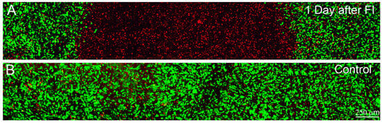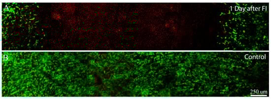 Maximum intensity projection images (~50 microns thick) of Live/Dead staining after 1 day of culture in 10% FBS. Live cells are labeled green and dead cells are labeled red. (A) 1 day after mechanical injury (MI), induced by pushing on the surface of the matrix using a probe with a 5mm diameter spherical tip; (B) 1 day control sample, which was left untouched.