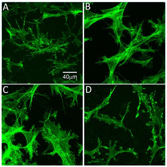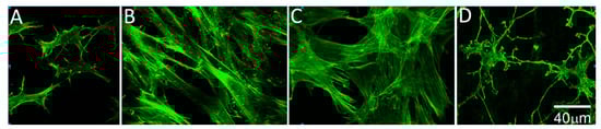 - Tomasek, J.J.; Hay, E.D.; Fujiwara, K. Collagen modulates cell shape and cytoskeleton of embryonic corneal and fibroma fibroblasts: Distribution of actin, α-actinin and myosin. Dev. Biol. 1982, 92, 107–122. [Google Scholar] [CrossRef]